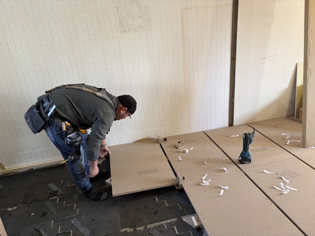 スラブ(GL)にジャッキを置き、その上にパーチクルボードを敷き均して行きます。