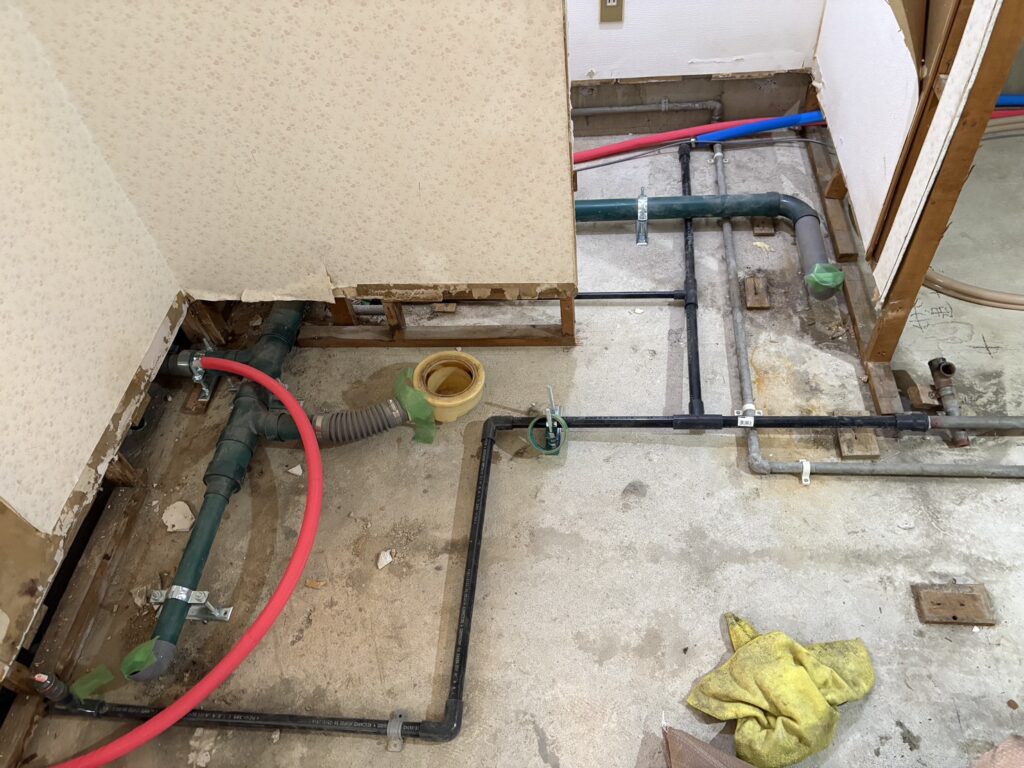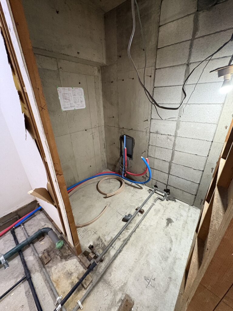 【給水給湯配管】以外にも、【排水】や【エアコン冷媒管】【電気配線】等々…様々な隠蔽設備を先行で施工する事が必要となります。