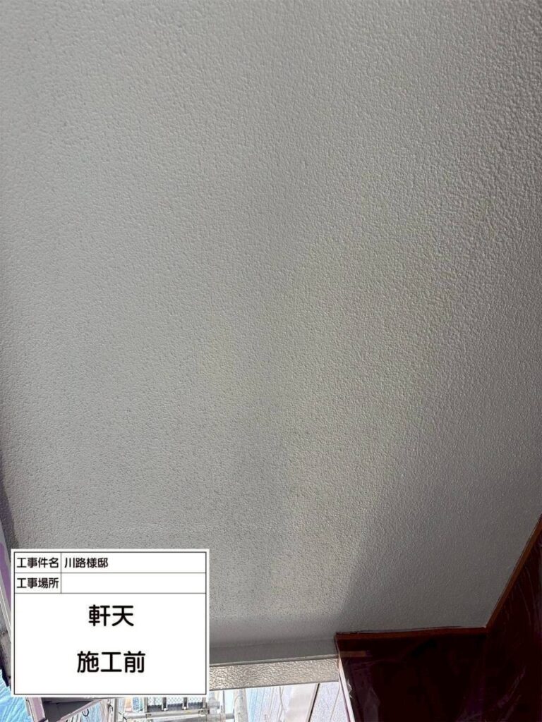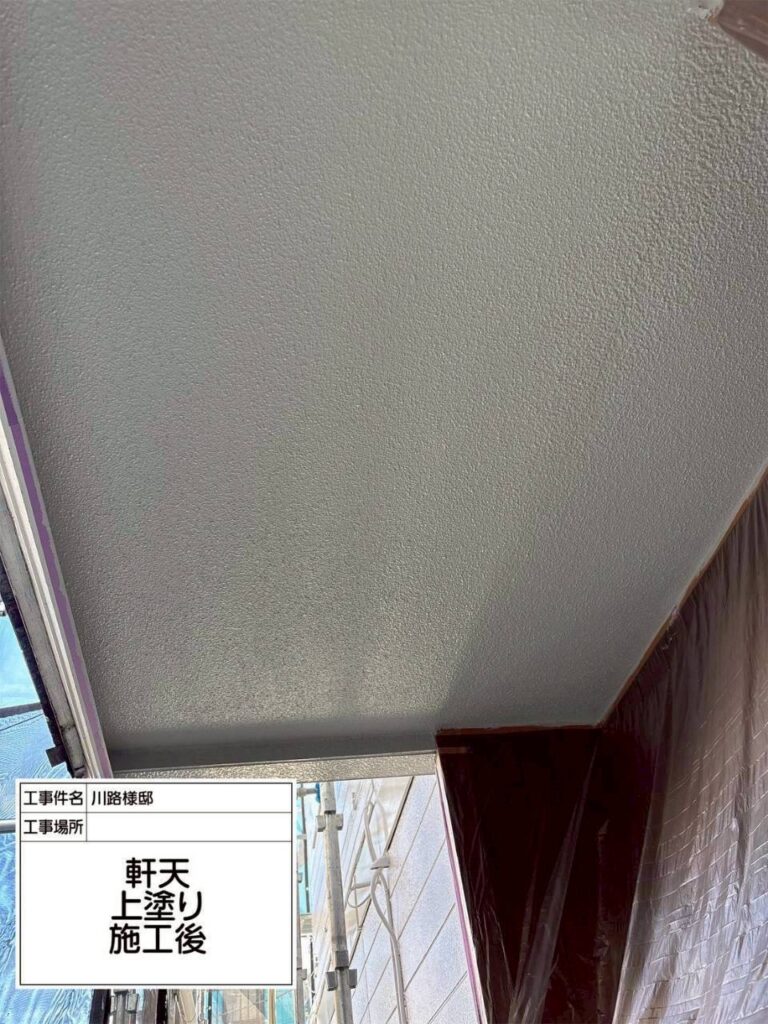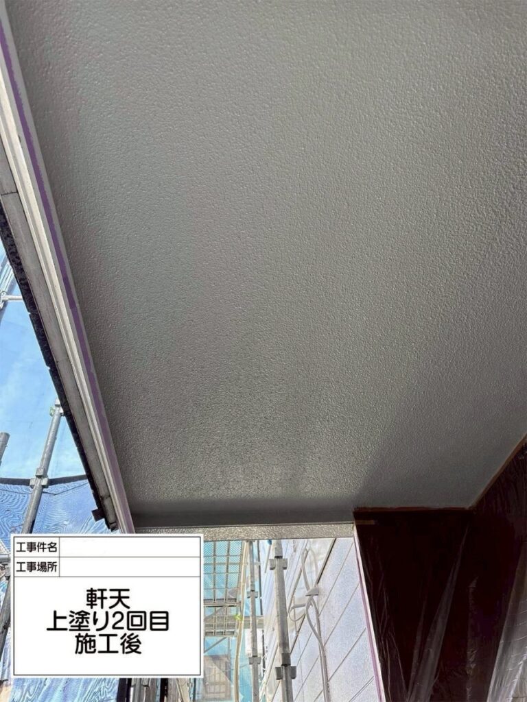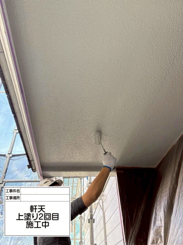 工程順序は、軒天井の作りや塗装する色によっても異なりますが、基本的には『外壁塗装下塗り⇒軒天塗装』の流れが多いと思います。※職人さんによっても異なります。