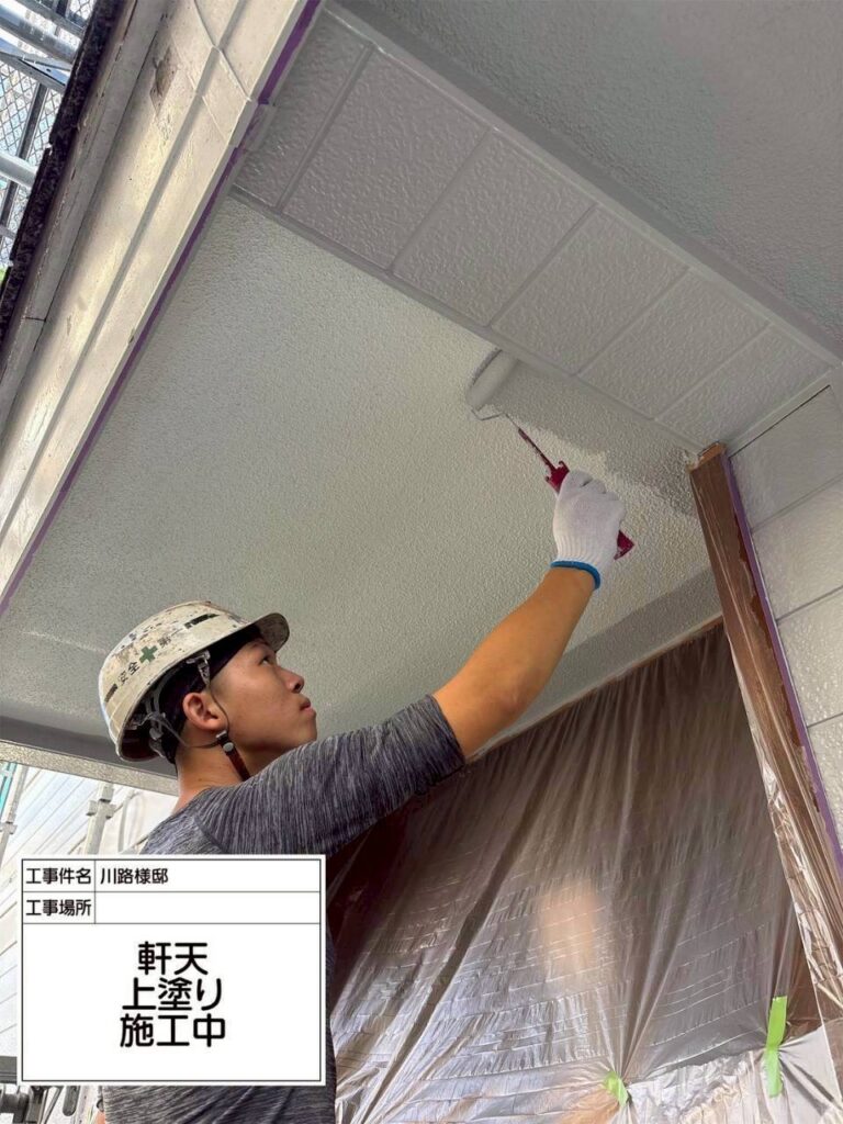 外壁塗装下塗りが完了したら、次は軒天塗装となります!