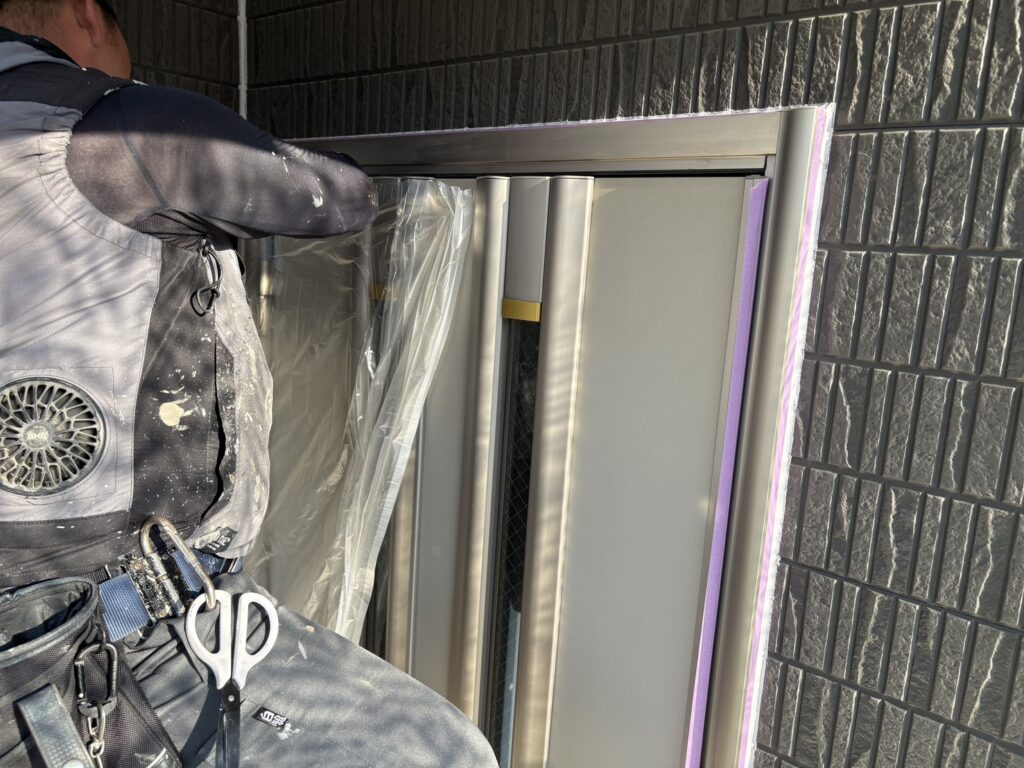 外壁塗装工事の際、サッシ類への塗装は行いません。塗料付着防止の為に必ず行う作業となります。