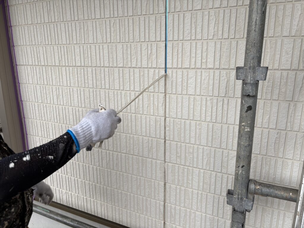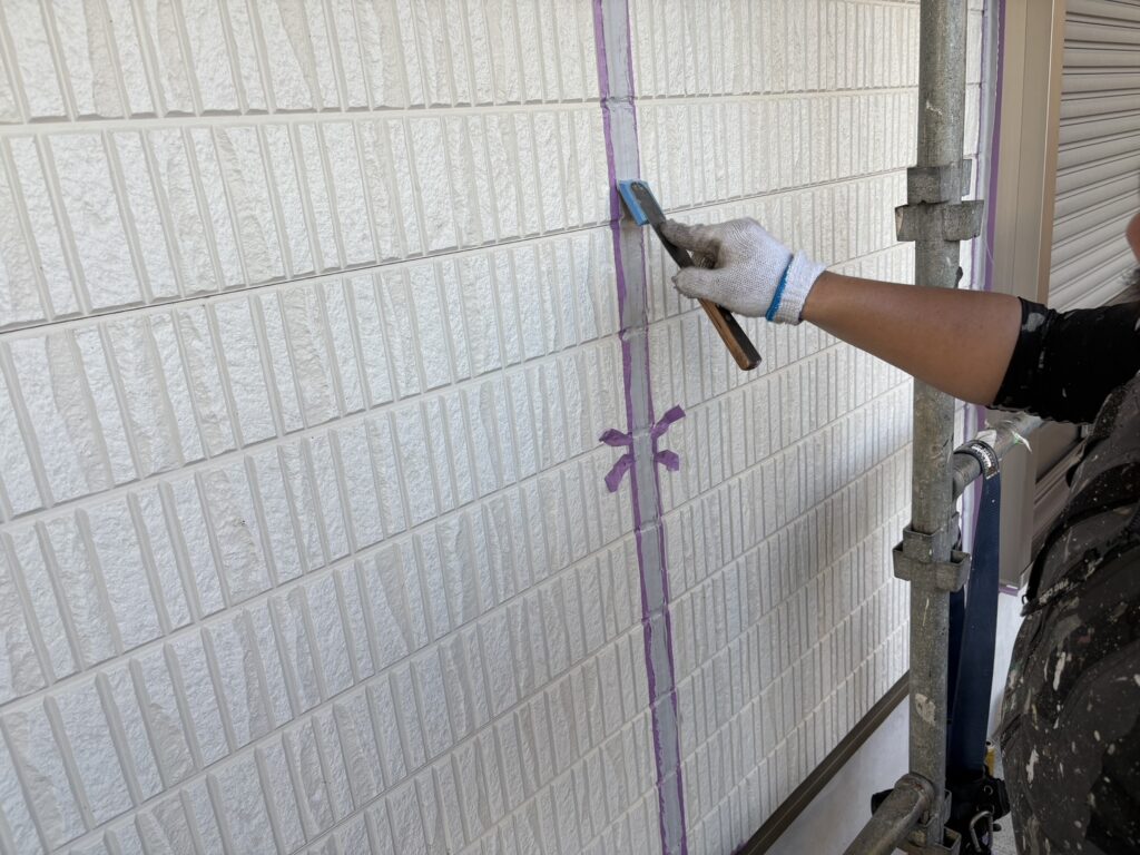 外壁塗装工事では、『竪(たて)目地』【打ち替え】行い、『窓廻り目地』【打ち増し】を行います。