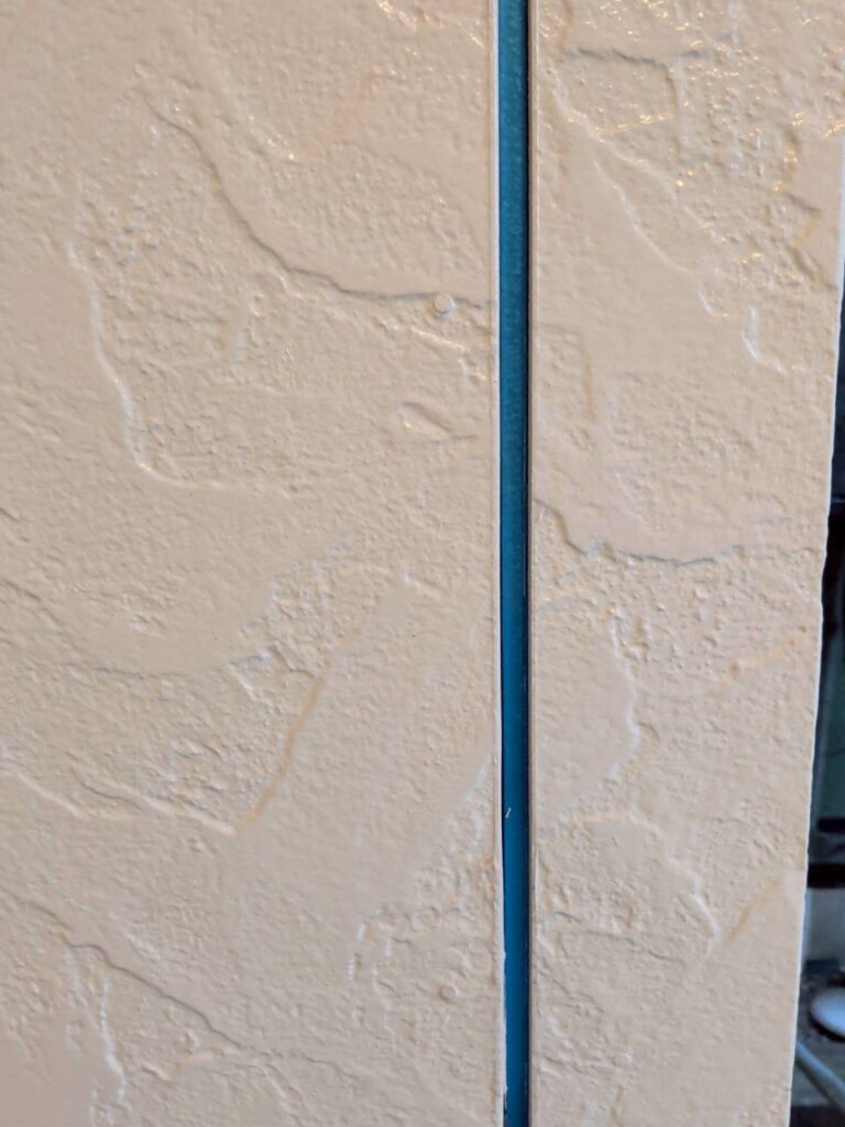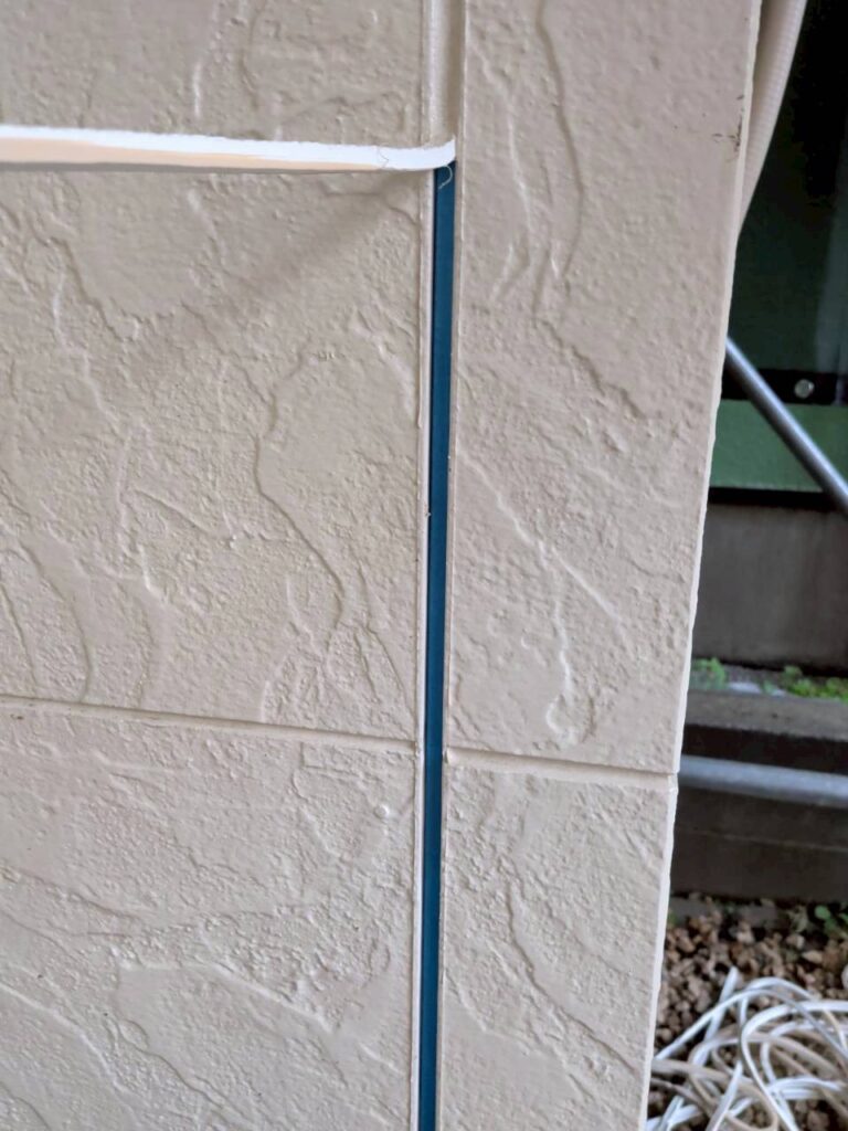 キレイに撤去する事が出来ましたね。青く見えるのは【ジョイナー】と言う役物になります。サイディングや石膏ボードの継ぎ目(目地)に設置し、幅の均一化、2点接着による防水・耐震性の向上、目地材の3点接着を防ぐ役割を持つ棒状の建築部材となります。青色以外にも銀色や緑色の資材もあります。