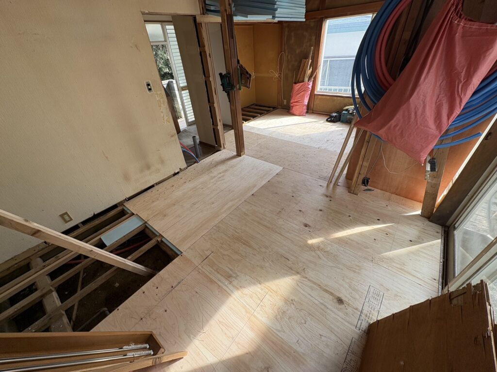 根太補強、床下地張り、給水給湯管新設等を行っています(*’▽’)