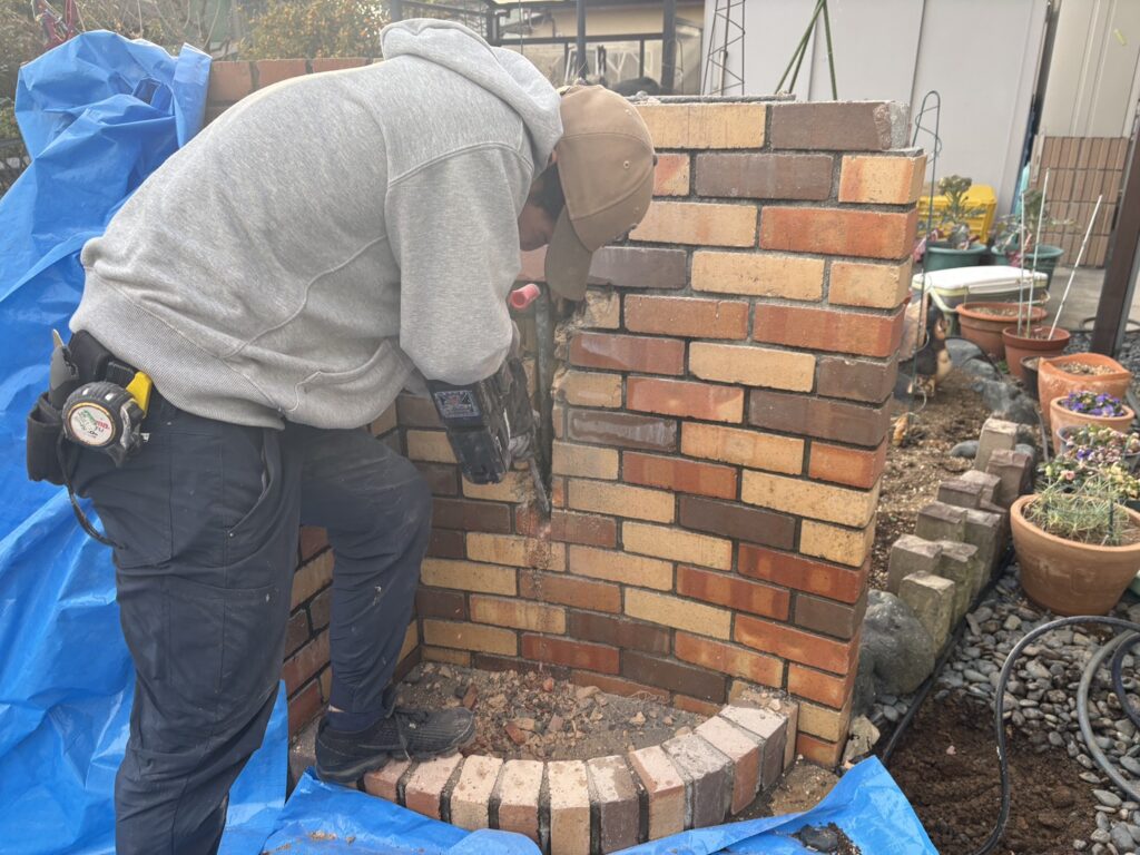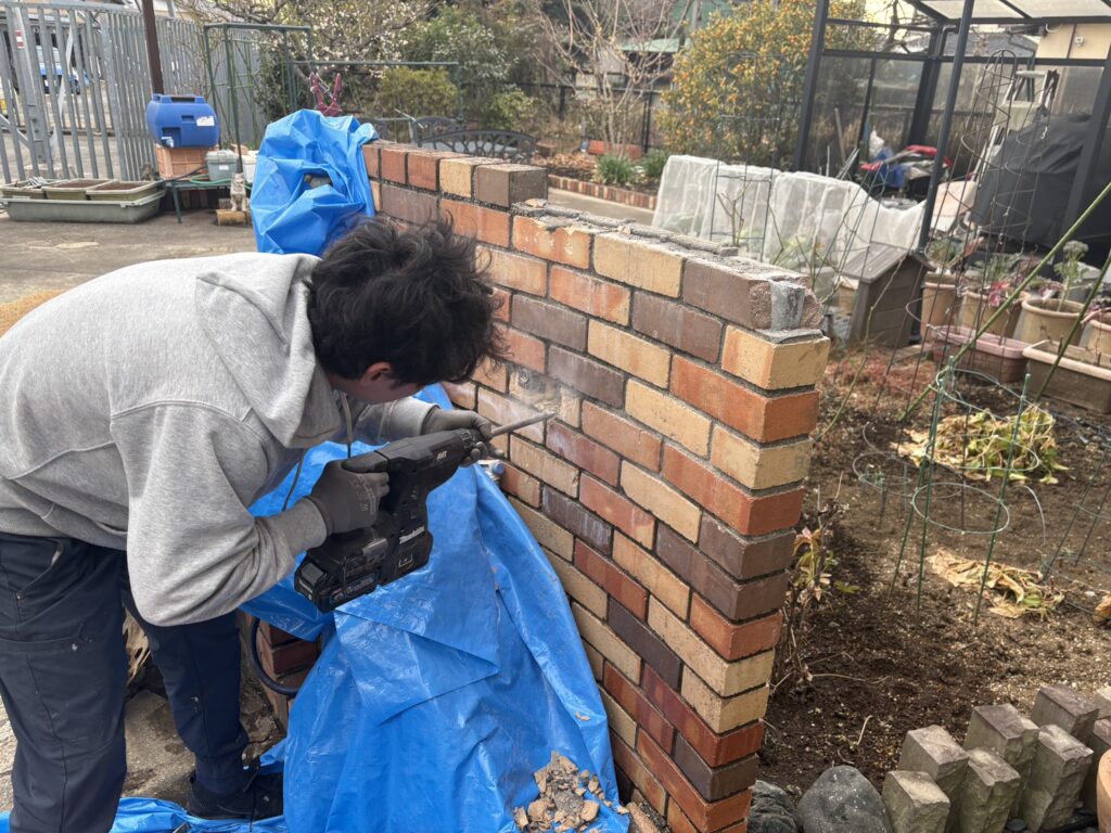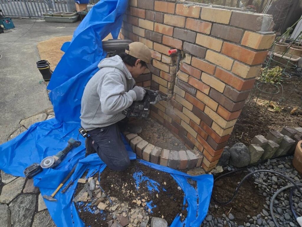 タイル壁内部に埋設してある水道管なので、まずは水道管埋設部を斫る作業から始めます。