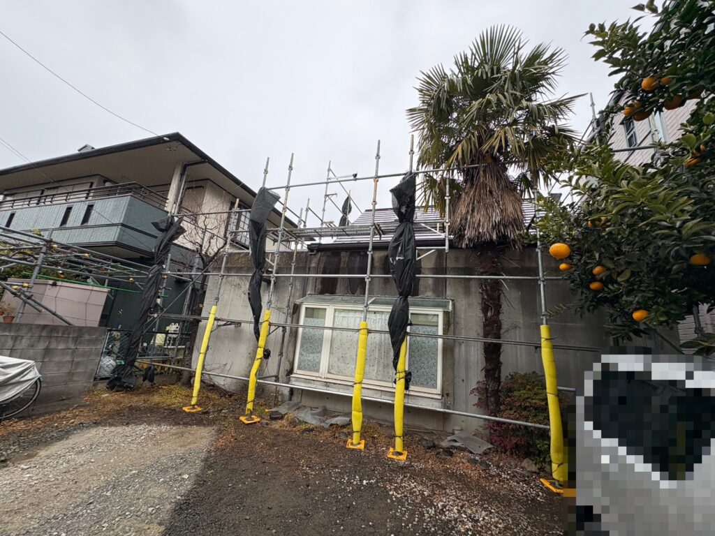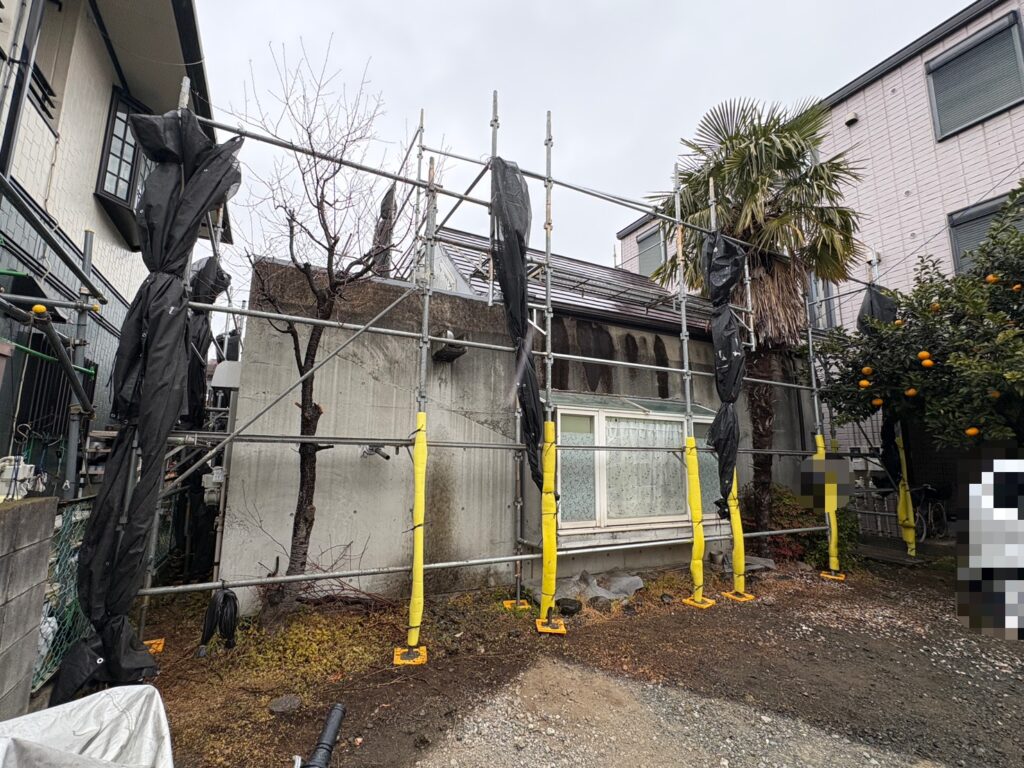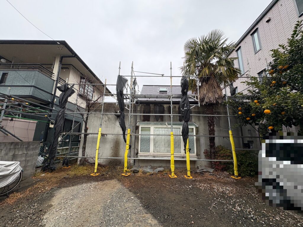 2026/2/14(土)、本日は平塚市にて施工させて頂く事になりました『外壁金属サイディング工事』準備の為、【足場架け】を行いましたので、足場Before/After画像の投稿をさせて頂きます。